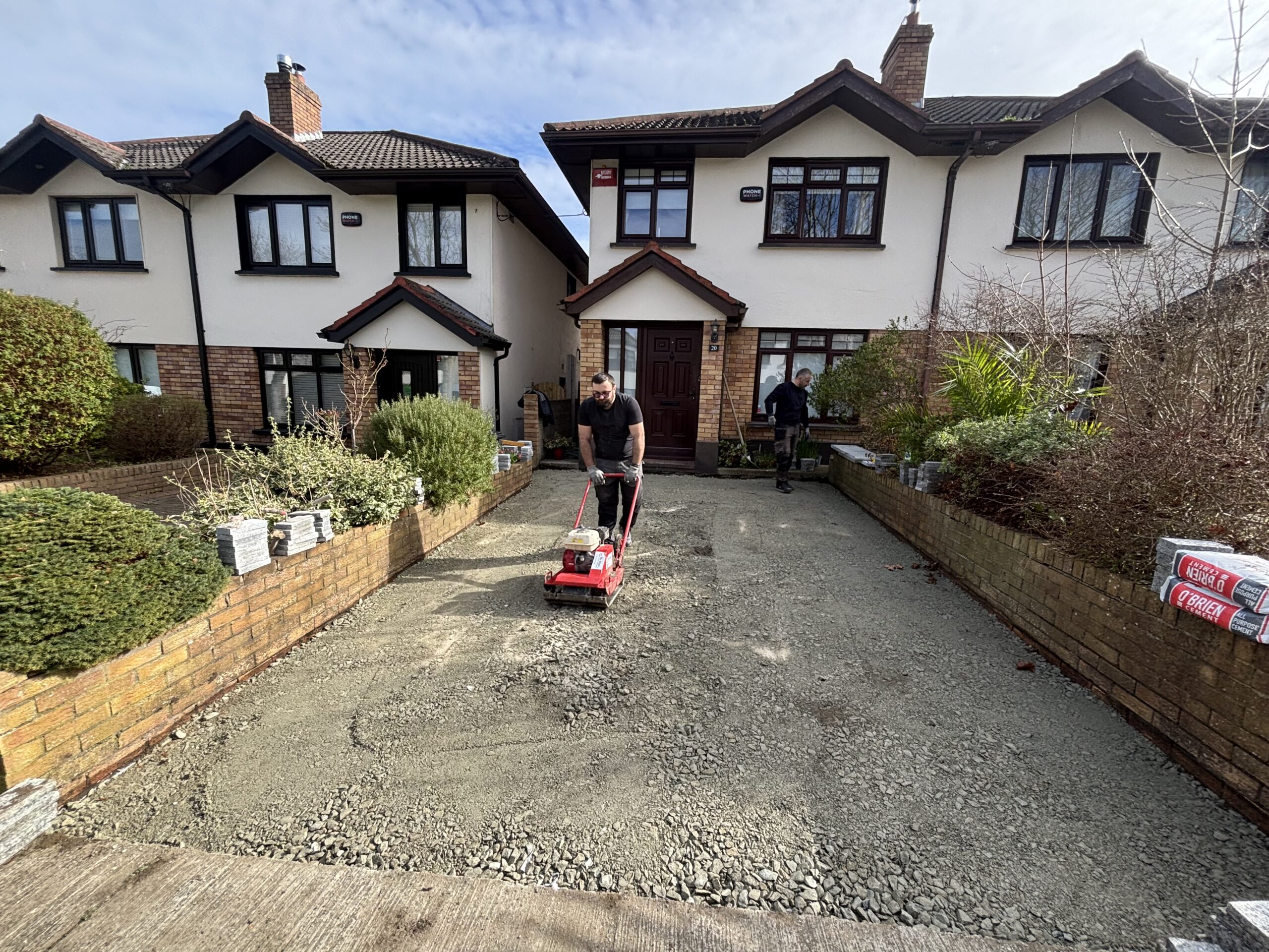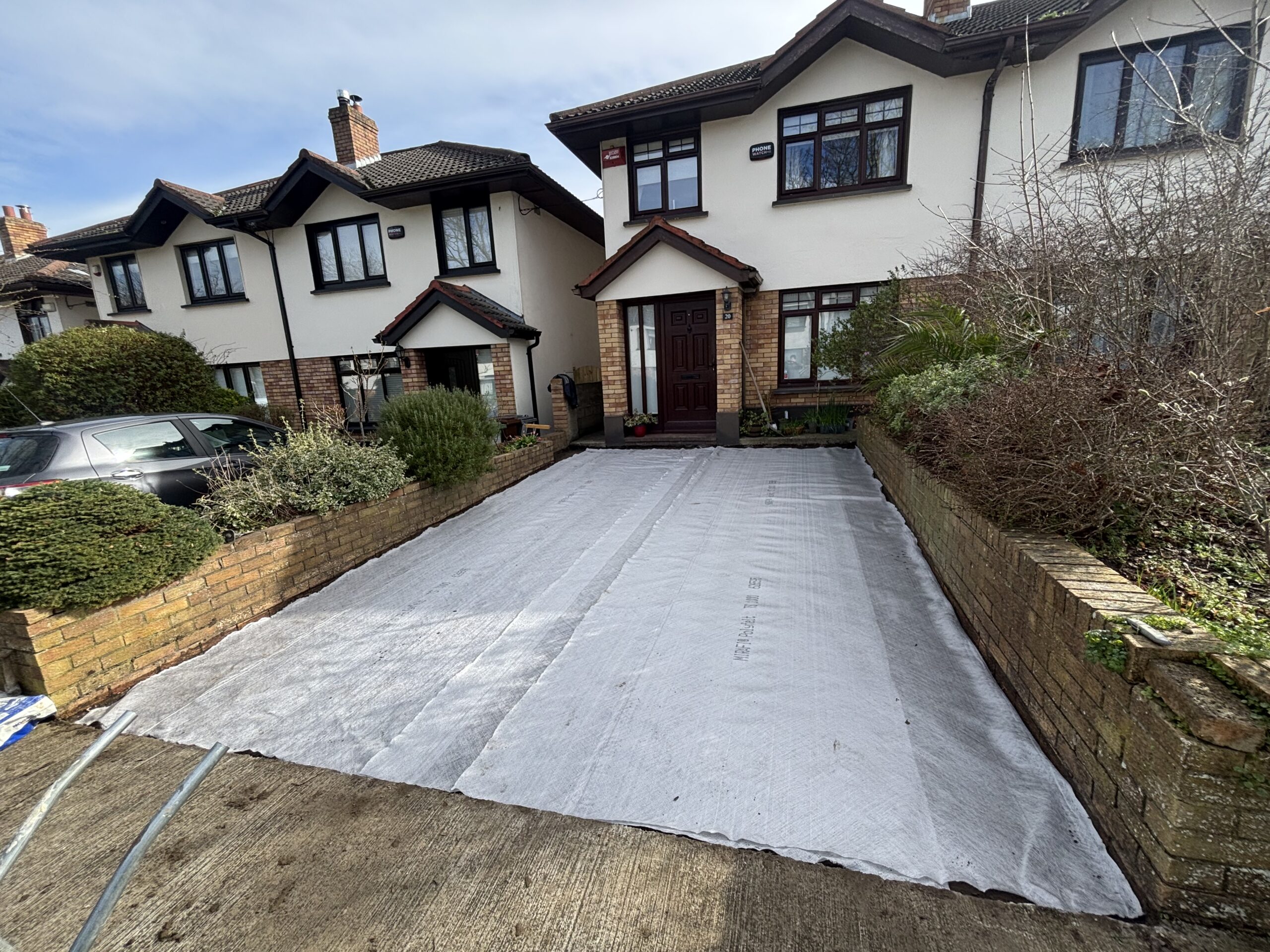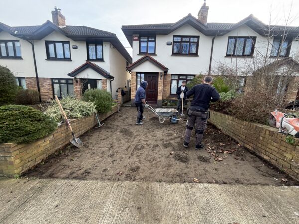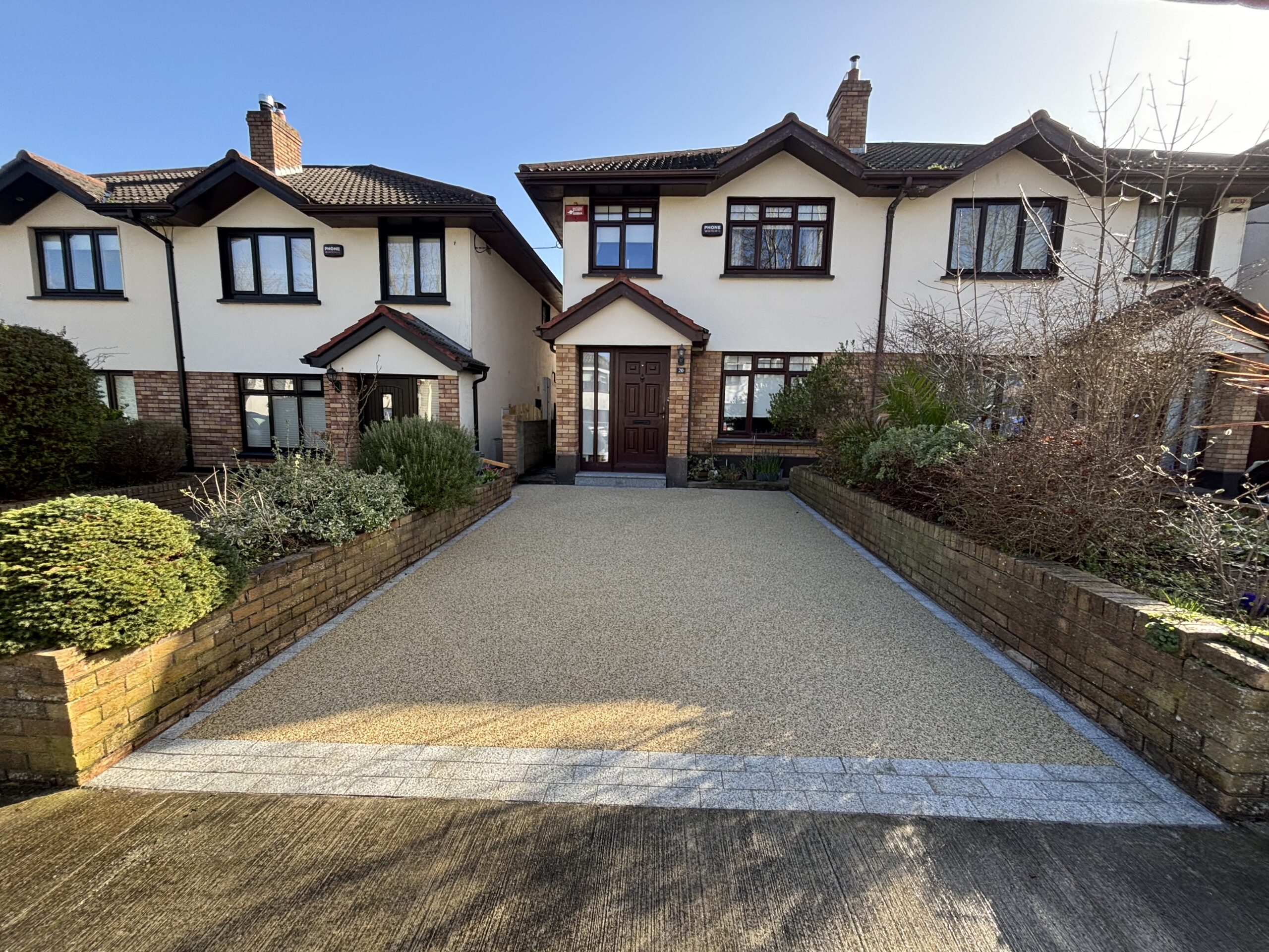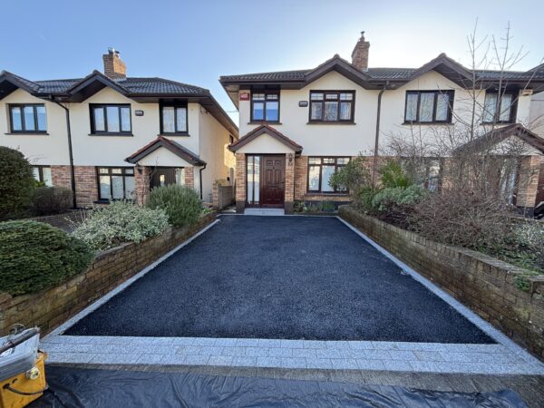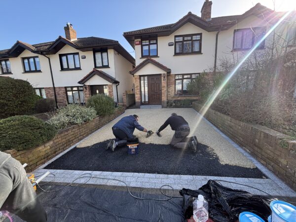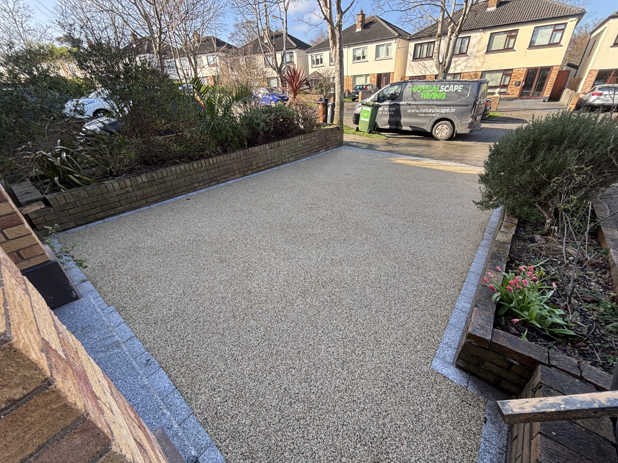 Dug out and removed the area, Supplied and installed 804 stone base, Supplied and installed membrane sheeting, Laid resin bound surface New step(s)New resin driveway installation in Rathfarnham with a porous tarmac base, granite stone border and apron with a gold resin chip finished surface.