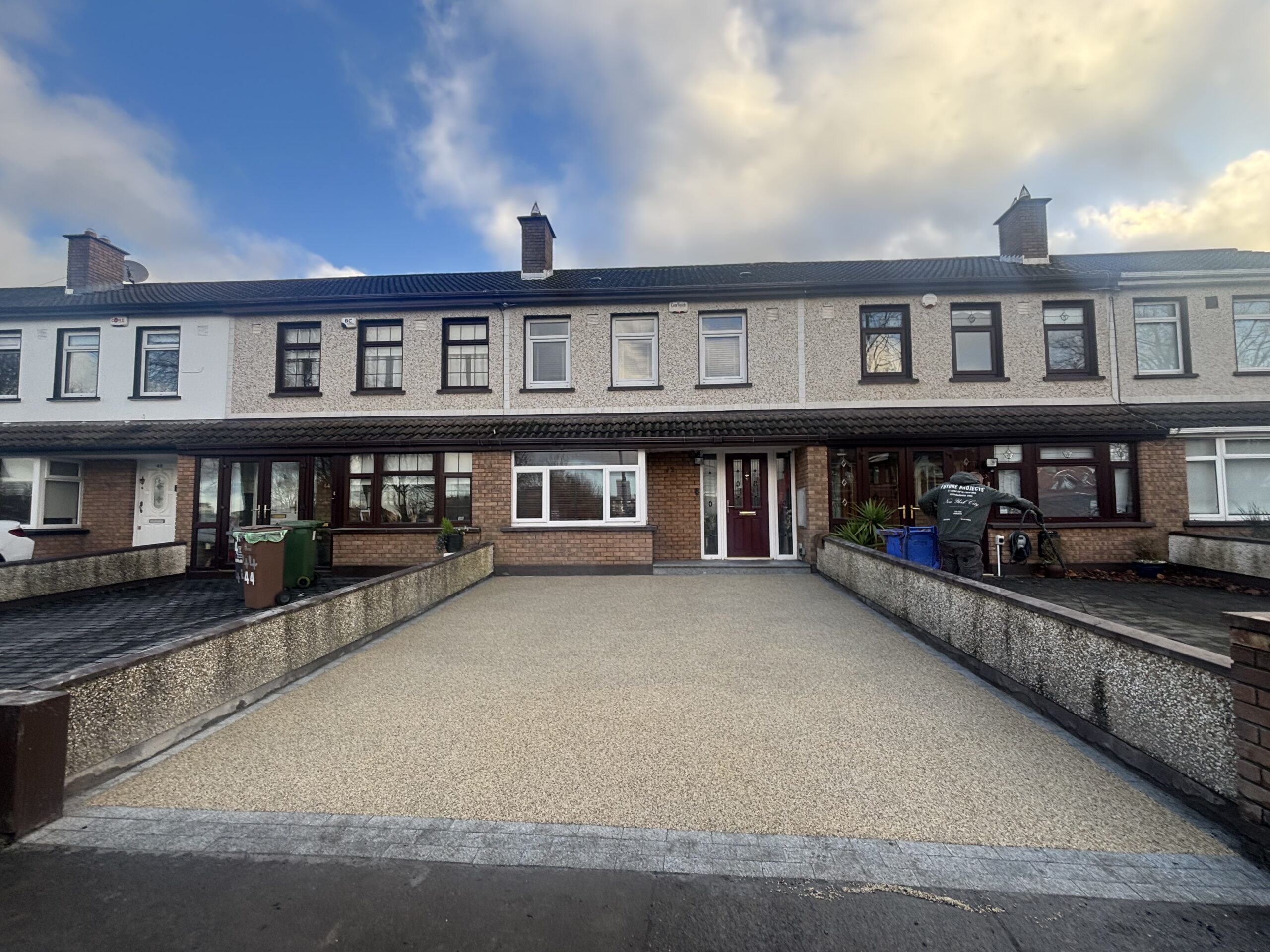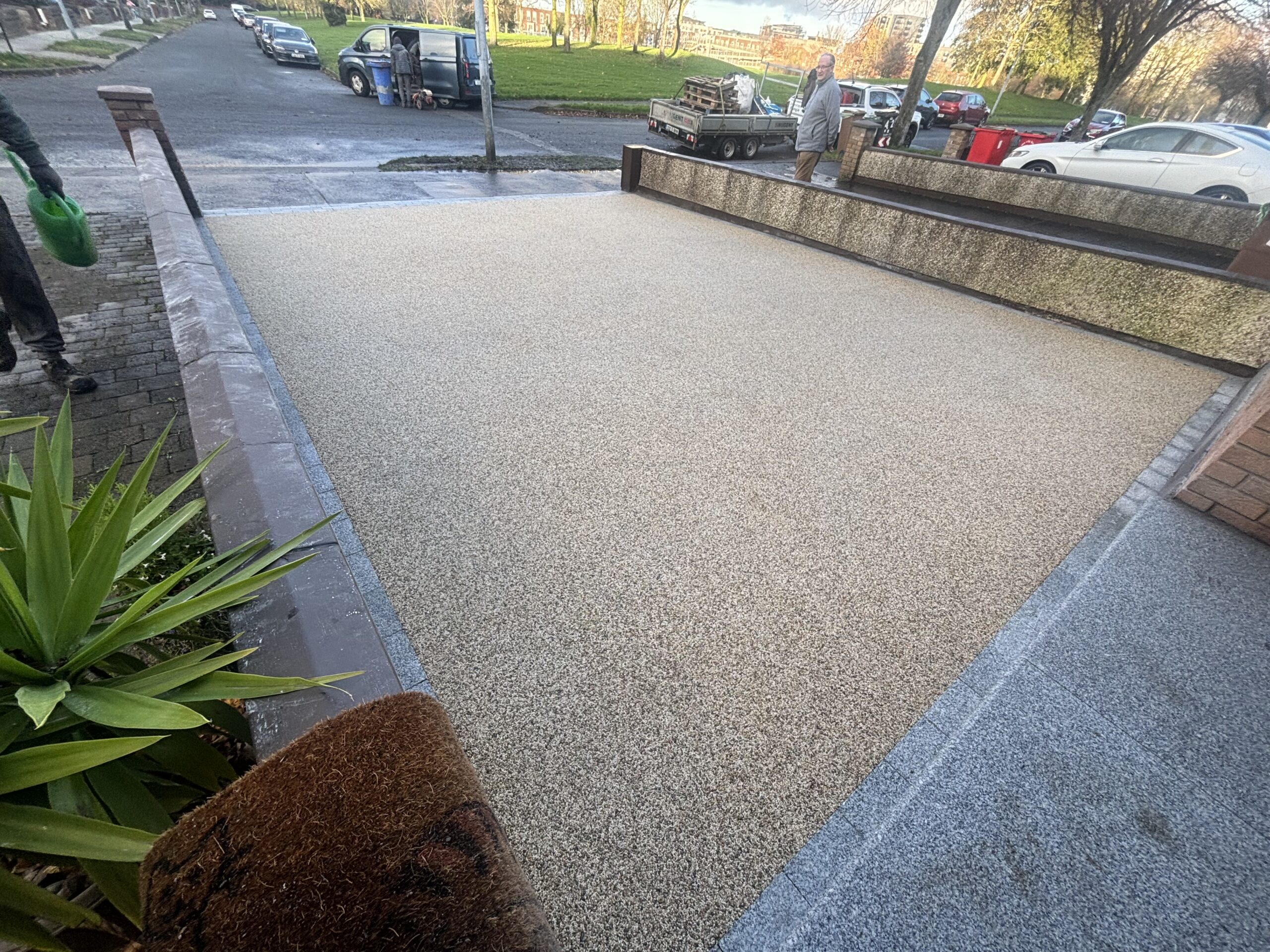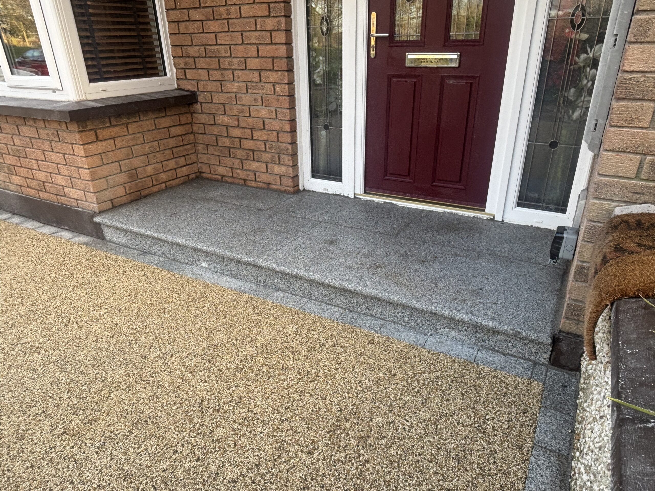 Dug out and removed the area, Supplied and installed 804 stone base, Supplied and installed MOT Type 1 foundation, Laid resin bound surface New step(s), New drainage system, New recessed coversDriveway and patio completed using pont du guard resin with silver granite cobble borders and silver granite steps