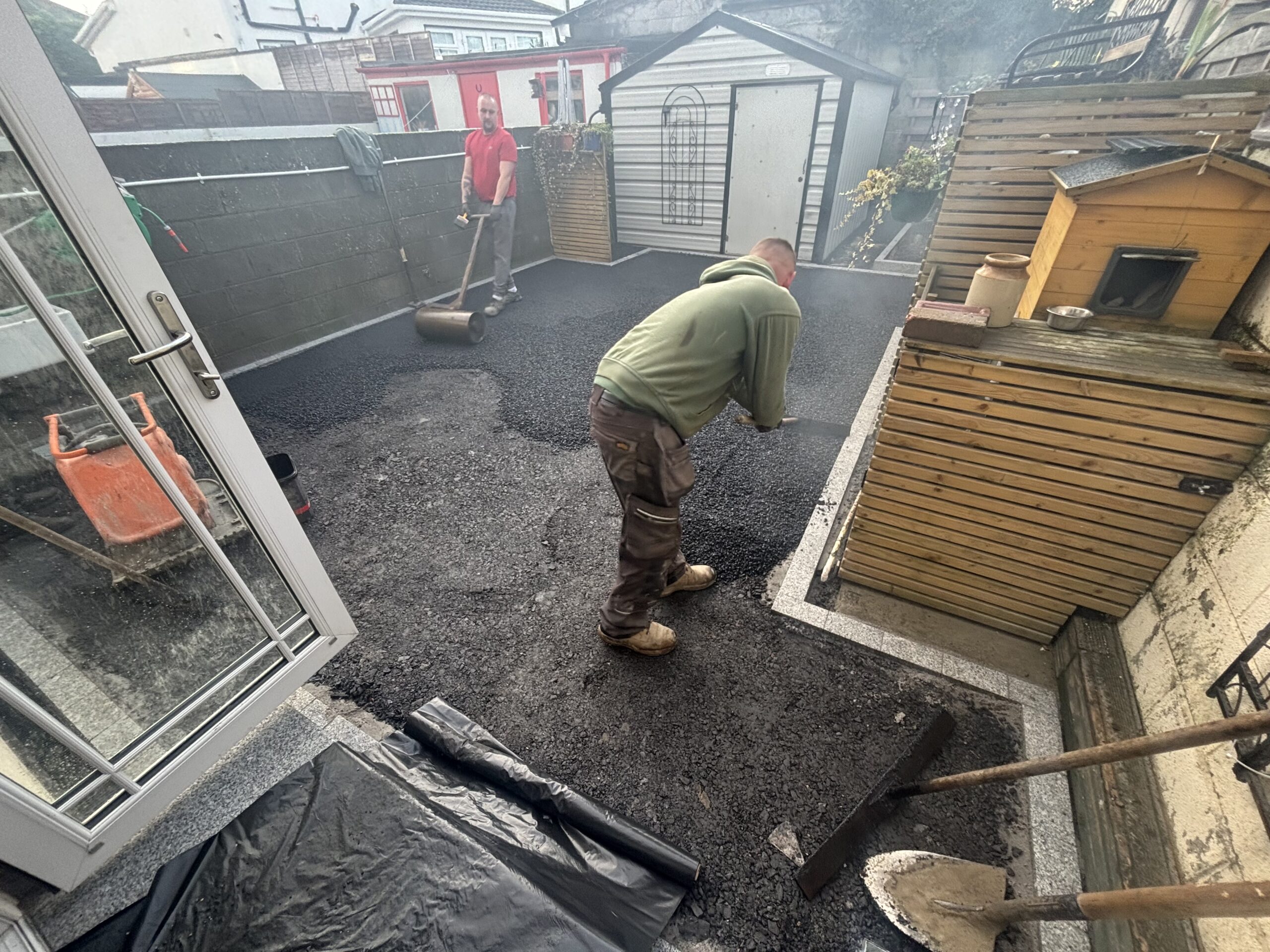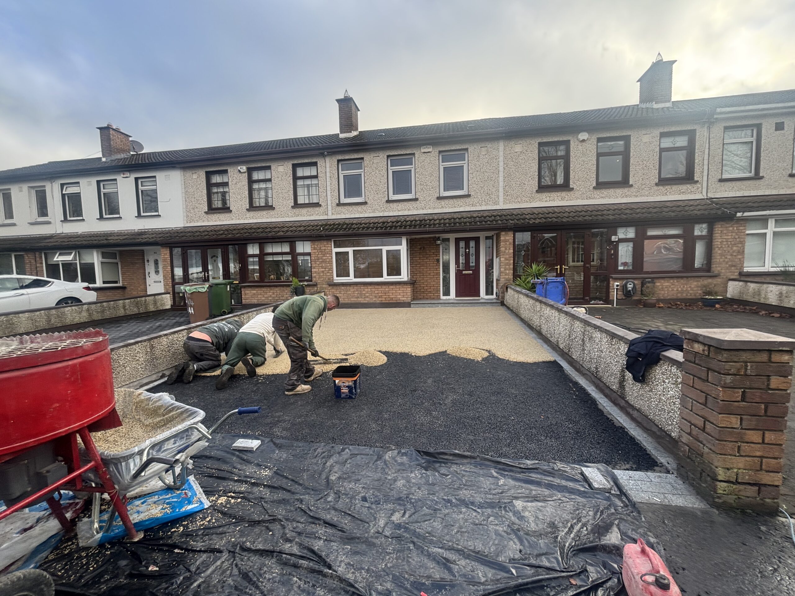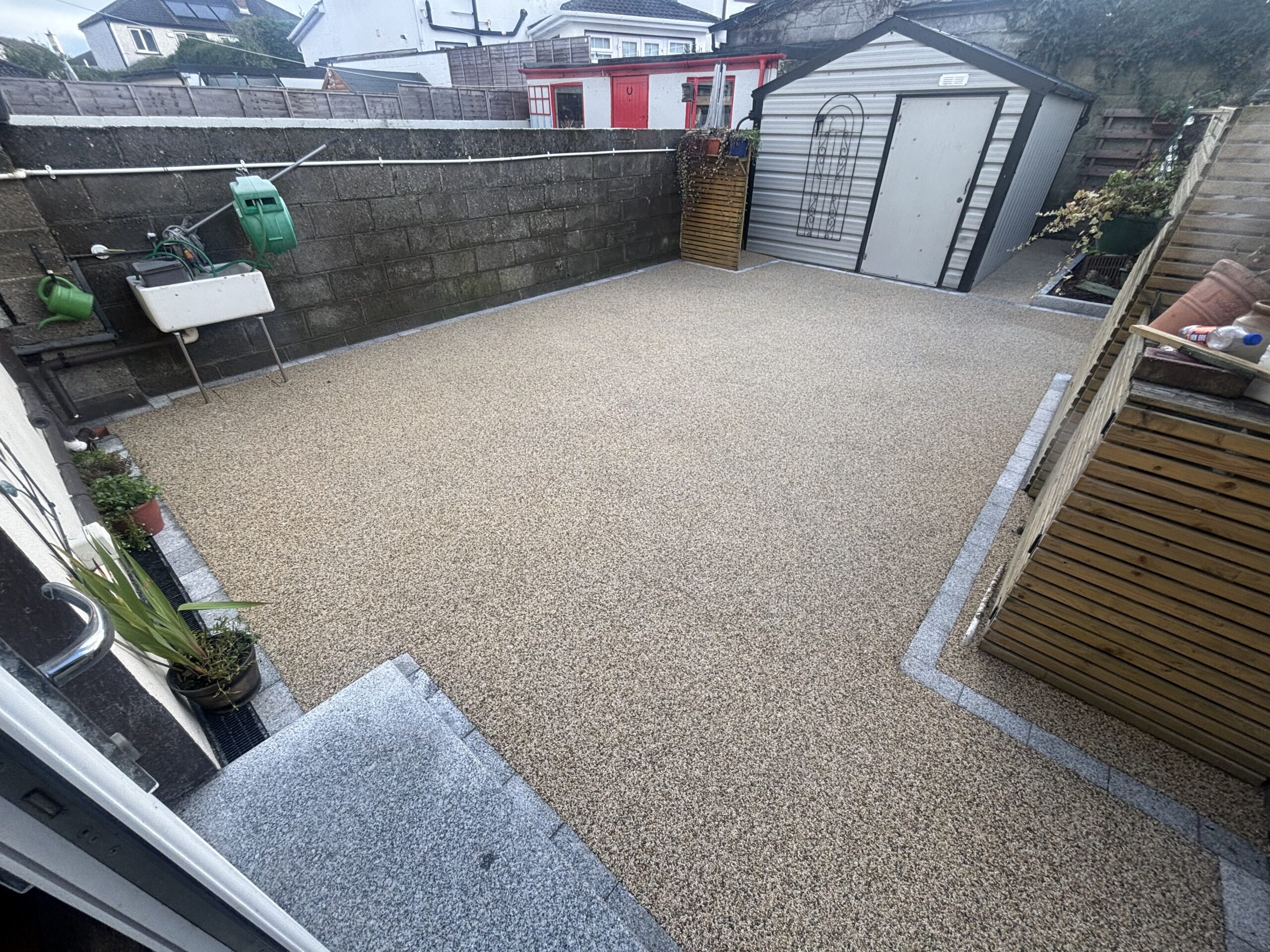 Dug out and removed the area, Supplied and installed 804 stone base, Supplied and installed MOT Type 1 foundation, Laid resin bound surface New step(s), New drainage system, New recessed coversDriveway and patio completed using pont du guard resin with silver granite cobble borders and silver granite steps